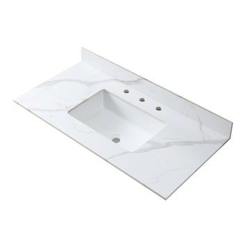 • The vanity tops are made of beautiful Sintered stone. All exterior sides are polished for a luxurious look. Each model is complemented with a ceramic Rectangle undermount sink. The matching backsplash is included in each package.