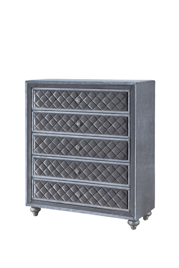 1Pc Glam 5 Drawer Chest Velvet Tufted Drawer Front Faux Crystal Drawer Knobs Bedroom Furniture Gray Bedroom Glam Wood