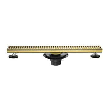 24 Inches Linear Shower Drain With Removable Quadrato Pattern Grate, 304 Stainless Shower Drain Included Hair Strainer And Leveling Feet, Flange Brushed Gold Stainless Steel