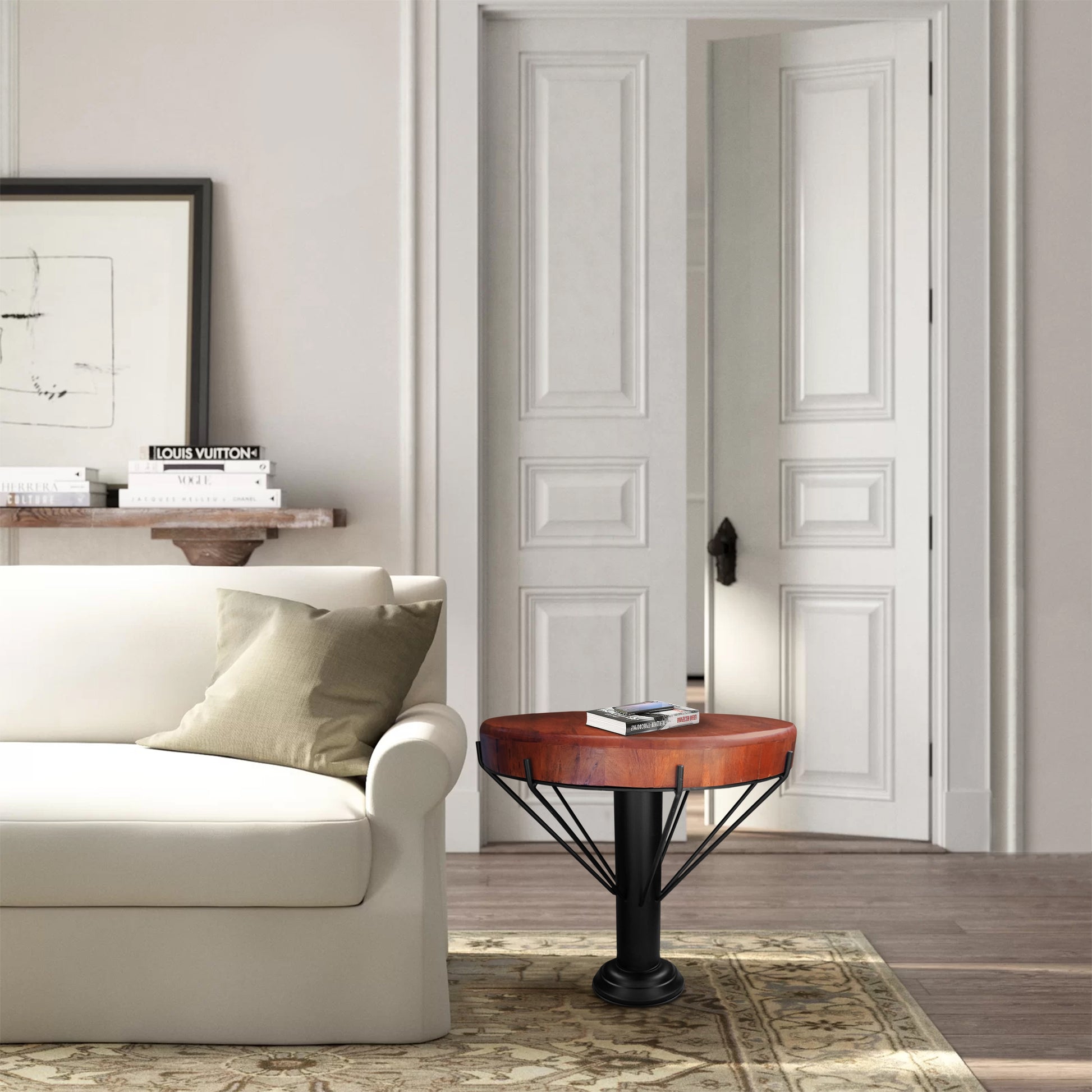 26 Inch Handcrafted Round Side End Table, Thick Mango Wood Top, Black Iron Pedestal Base Black Brown Metal & Wood