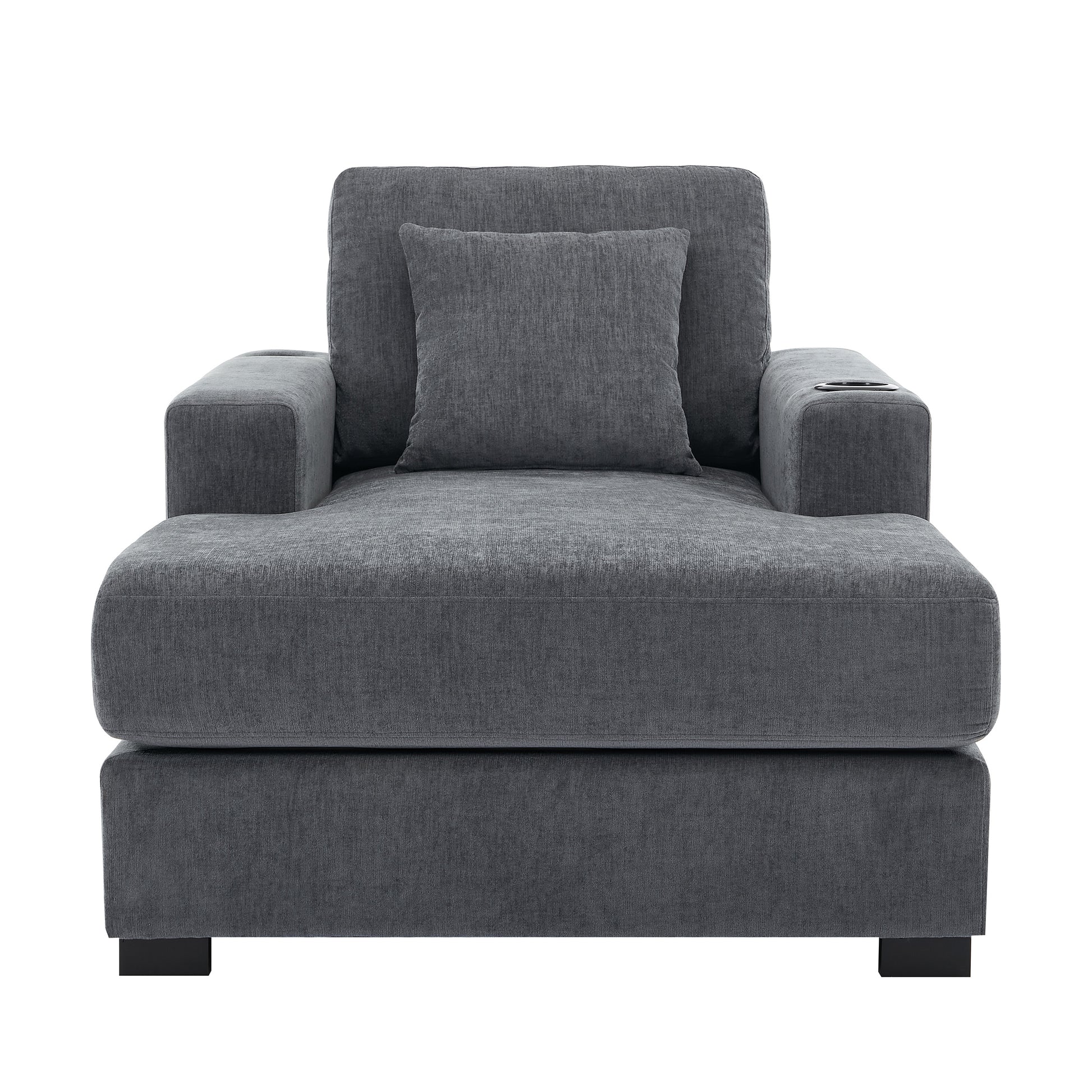 Indulge in luxurious comfort with our Oversized Chaise Lounger, meticulously crafted with plush chenille fabric that offers a blend of softness and durability. Available in three sizes (39.7", 43.5", 55"), this lounger is designed to cater to various spaces and preferences. It features a built-in Charge Station for conveniently powering your devices, ensuring you stay connected while you relax. The practical Cup Holders integrated into each armrest keep beverages close at hand, enhancing your lounging experience. For added convenience, all covers including pillows, seat cushions, and backrests are removable and washable, allowing for easy maintenance and long-lasting freshness.