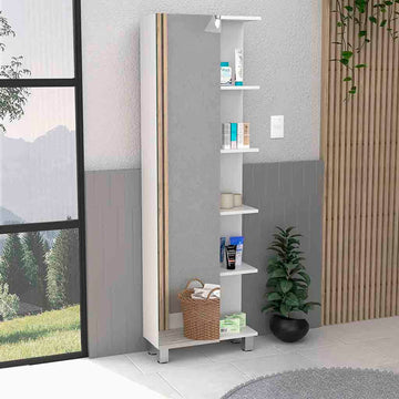 62H"Mirror Linen Single Door Cabinet, Five External Shelves, Four Interior Shelves, White White Particle Board Particle Board