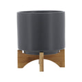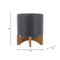 8" Planter W Wood Stand, Matte Gray Gray Ceramic