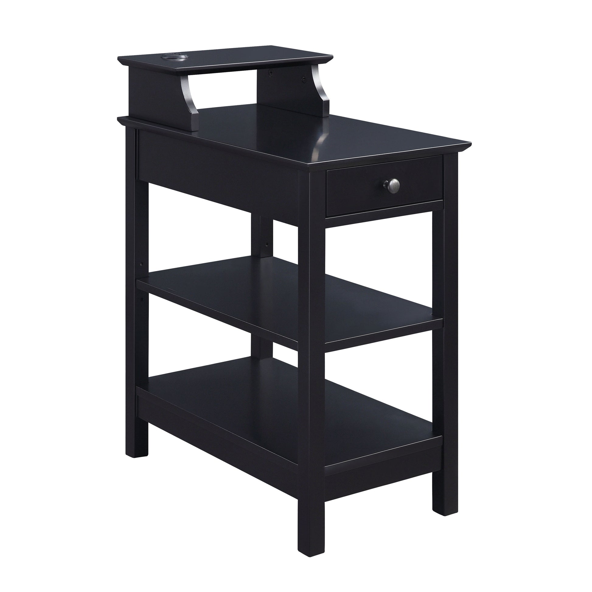 The accent table features 1 drawer and 3 open compartments, providing space for organizing belongings, while its top shelf incorporates a convenient Usb power dock for enhanced functionality. With a sleek black finish and durable Mdf construction, its straight-square leg design complements the overall aesthetic, blending practical storage with sophisticated style.