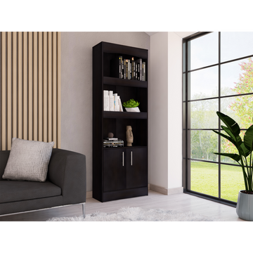 Bookcase, Three Shelves, Double Door Cabinet, Metal Hardware, Black Black Particle Board Particle Board
