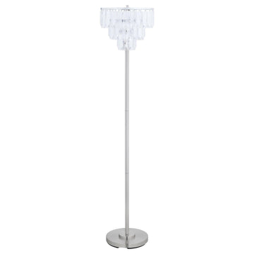 Sleek and modern, this metal floor lamp adds a sophisticated accent to a living room, bedroom, or den. A straight metal frame boasts a lovely silver finish, while an elegant crystal shade brilliantly reflects the light.