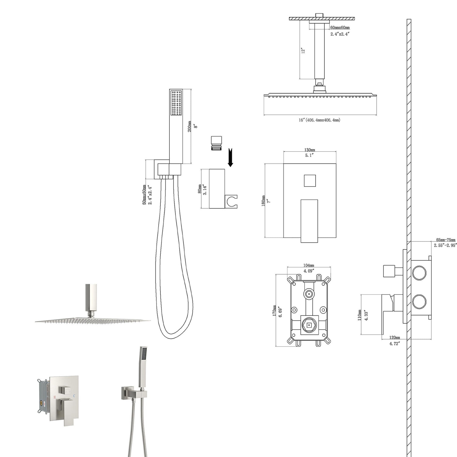 • {Included Components}16 inch Square rain shower head,Shower Arm, handheld shower head, 59" shower hose,shower holder, water control valve,Parts and installation instructions.