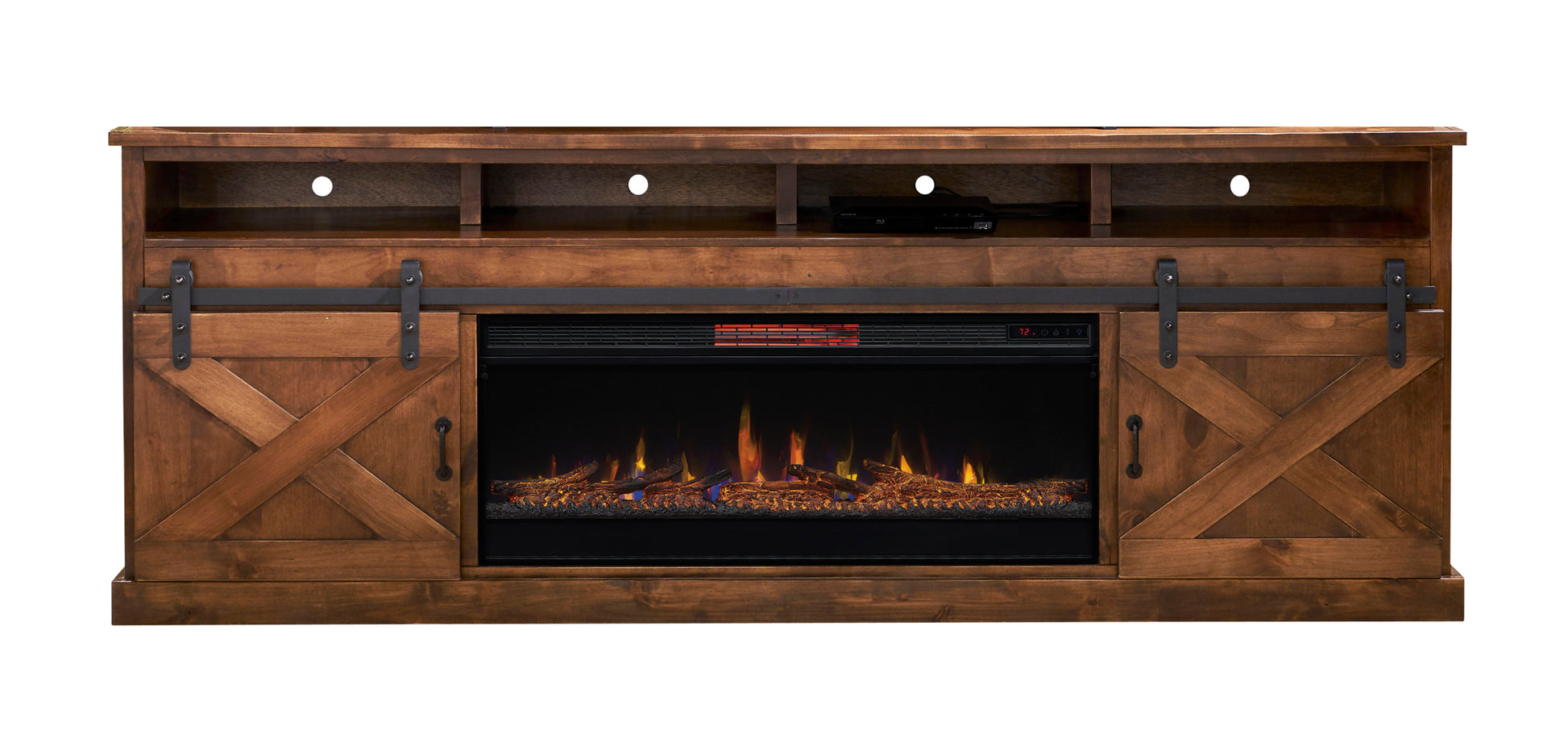 Farmhouse 93 Inch Electric Fireplace Tv Stand For Tvs Up To 100 Inches, Minimal Assembly, Aged Whiskey Finish Electric Brown Primary Living Space Alder Yes Insert Electric 41 50 Yes Brown 400 Vent Free Farmhouse,Lodge,Rustic Wood