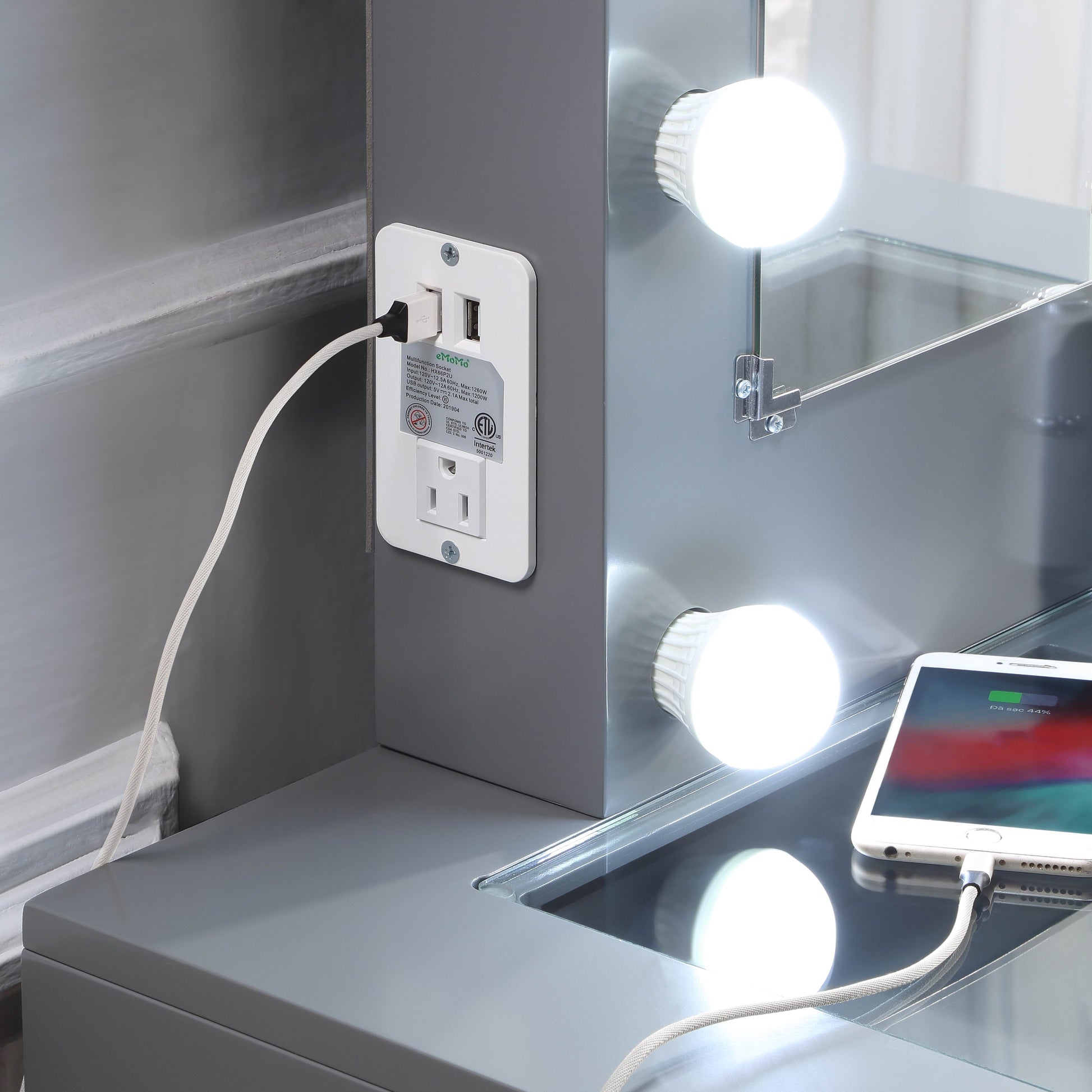 Elevate your daily beauty routine with our Makeup Vanity in pristine white. This versatile and elegant piece is designed to enhance your space while providing the functionality you need. Equipped with 10 lights for optimal illumination, a built-in Usb and power outlet for convenient charging, and a comfortable matching stool, this makeup vanity is a must-have addition to your bedroom or dressing area. The sleek gray finish adds a touch of modern sophistication, while the spacious drawers offer storage for your beauty essentials. Experience the perfect blend of style and practicality with our Makeup Vanity, designed to make your beauty rituals a truly enjoyable and luxurious experience.PRODUCT DIMENSIONS:Table: 31.5" x 20" x 53"HStool: 18" x 12" x 18"HListing Includes: Makeup Vanity and Stool SetSimple Assembly Require.