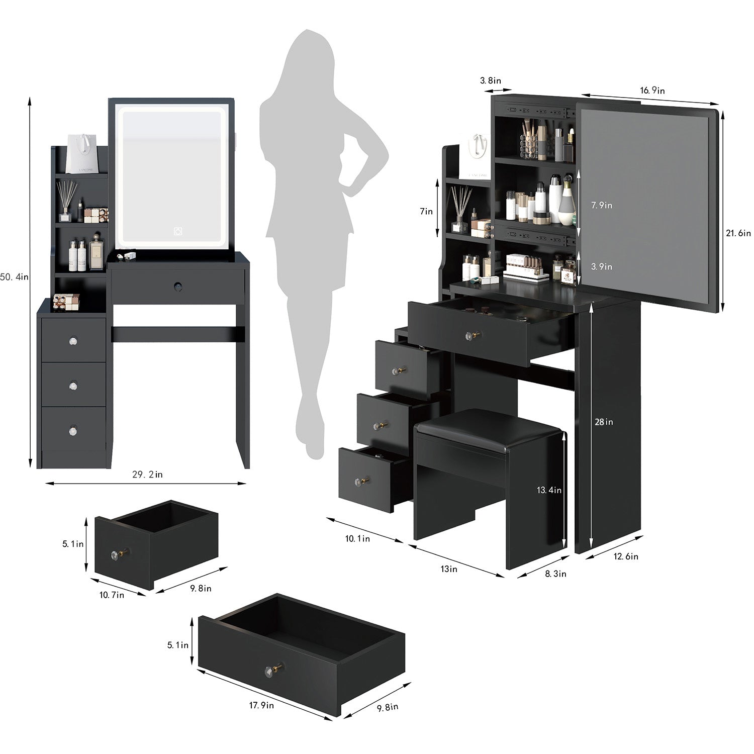 Small Space Left Bedside Cabinet Vanity Table Cushioned Stool, Extra Large Right Sliding Mirror, Multi Layer High Capacity Storage, Practical Fashionable Dresser, Suitable For Girls Up To 5.6Ft Tall Black American Design Mdf