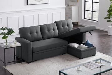Upholstered Pull Out Sectional Sofa With Chaise Dark Gray Foam Linen