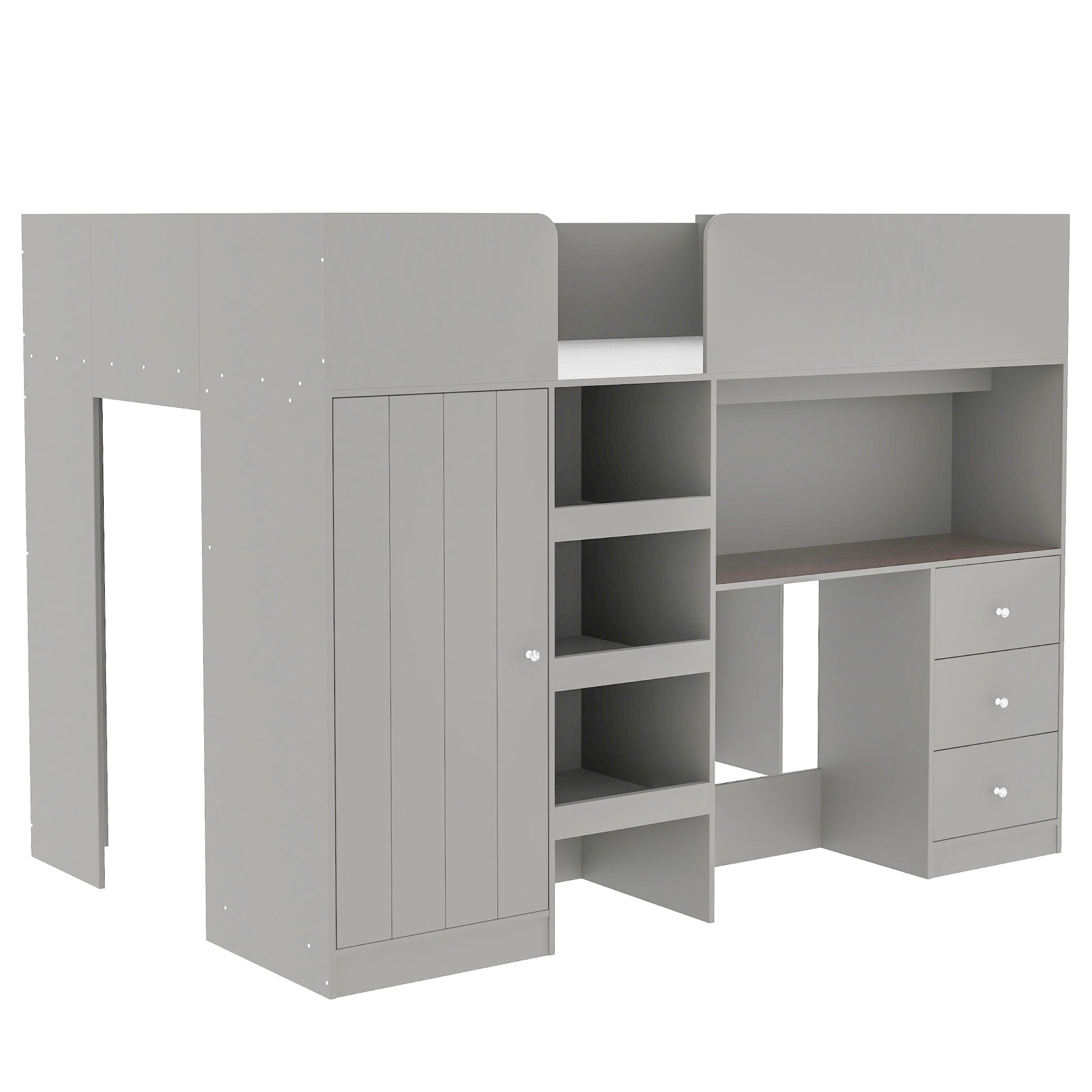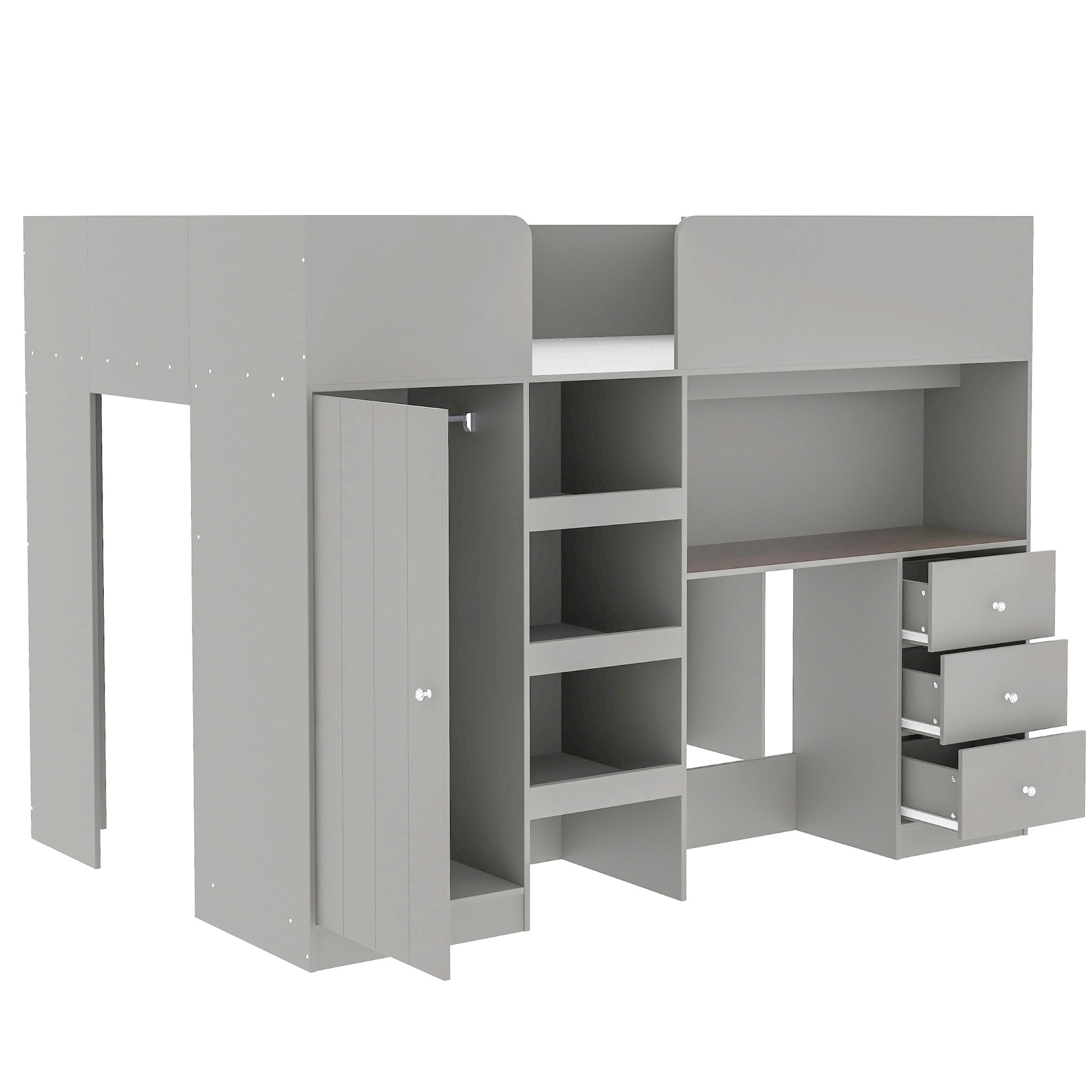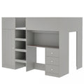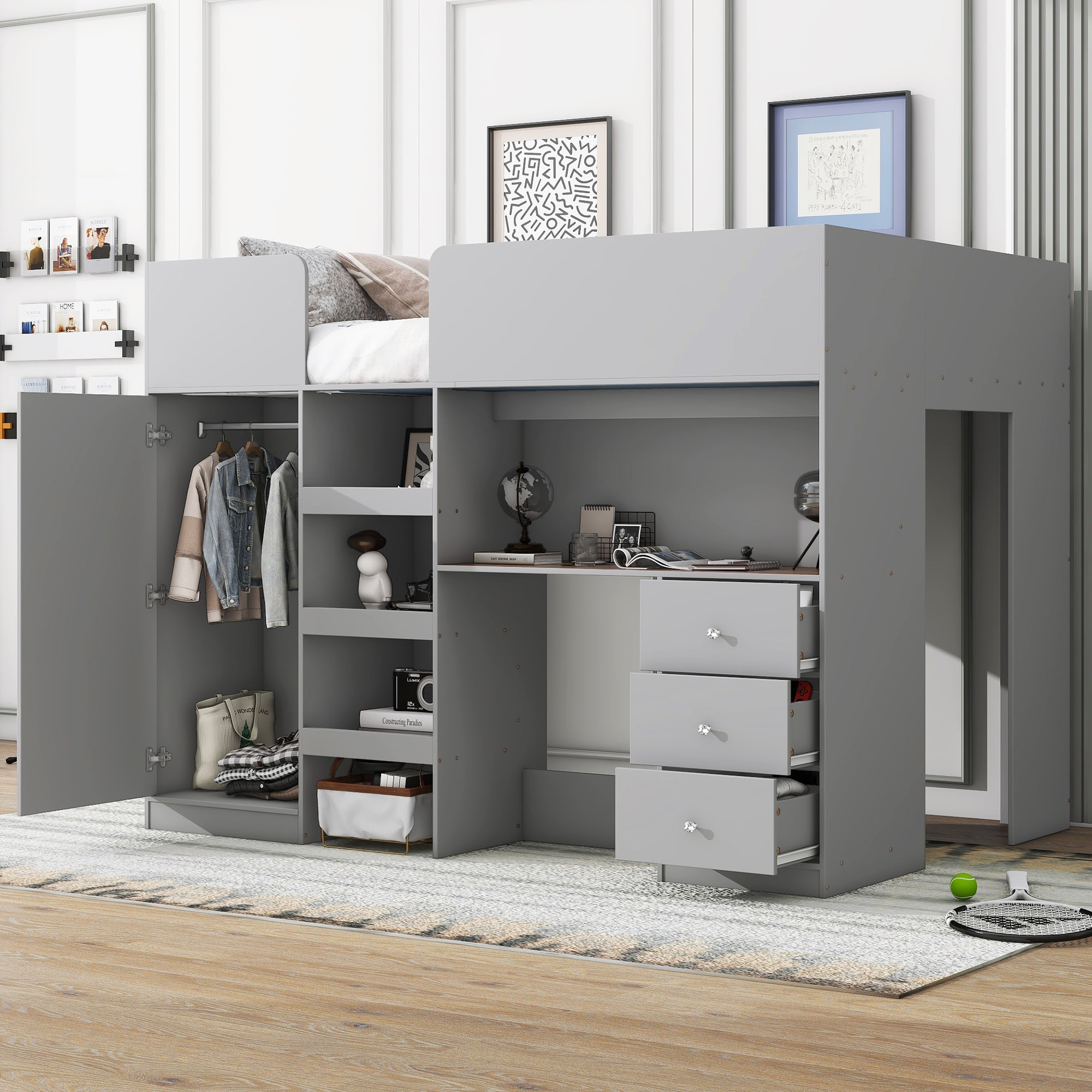 Wood Full Size Loft Bed with Built-in Wardrobe, Desk, Storage Shelves and Drawers, Grey